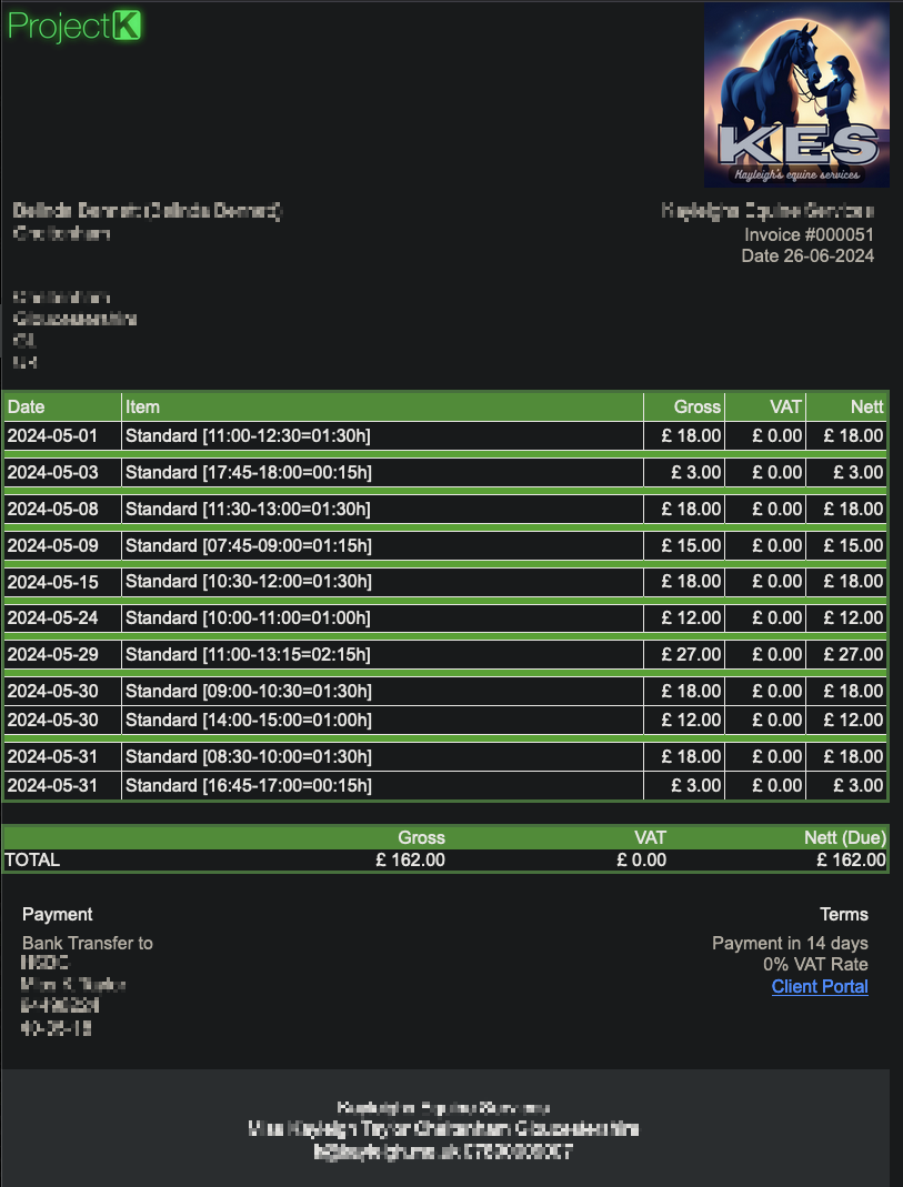 Configure the horses you work with, or are responsible for including the date of birth, breed, colour, owner, loaner, vet, insurer (with insurance numbers), farrier, Microchip, Allergies, PIO (organisation), contact numbers for the owner(s), and notes. Once added, you can attribute work to an animal, or not as you choose. When you are working specific animals, it does help to have them listed on the invoices.